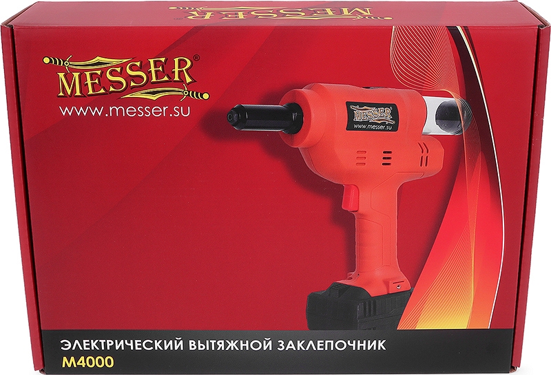 Аккумуляторный электрический вытяжной заклепочник Messer M4000 (Мессер М4000) предназначен для установки любых металлических вытяжных заклепок Ø 2,4 – 4,8 / 5,0 мм, включая нержавеющие стальные вытяжные заклепки.