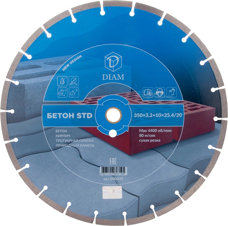 Алмазный отрезной круг Diam STD 1A1RSS Бетон 350 мм (Диам СТД 1А1РСС Бетон 350 мм) – сегментный алмазный диск для сухой резки бетона, кирпича, тротуарной плитки, природного камня, без водяного охлаждения.