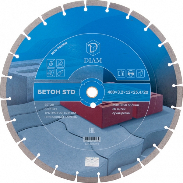 Алмазный отрезной круг Diam STD 1A1RSS Бетон 400 мм (Диам СТД 1А1РСС Бетон 400 мм) – сегментный алмазный диск для сухой резки бетона, кирпича, тротуарной плитки, природного камня, без водяного охлаждения.
