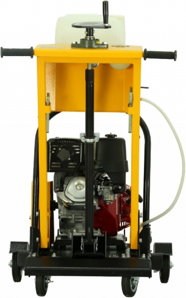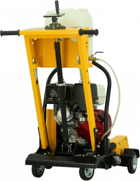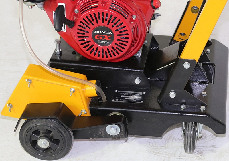 - Вращающиеся вокруг вертикальной оси задние колеса позволяют своевременно и без лишних усилий направлять в нужную сторону и вести криволинейный рез бетона, железобетона, асфальта, повторяя изгиб трещины