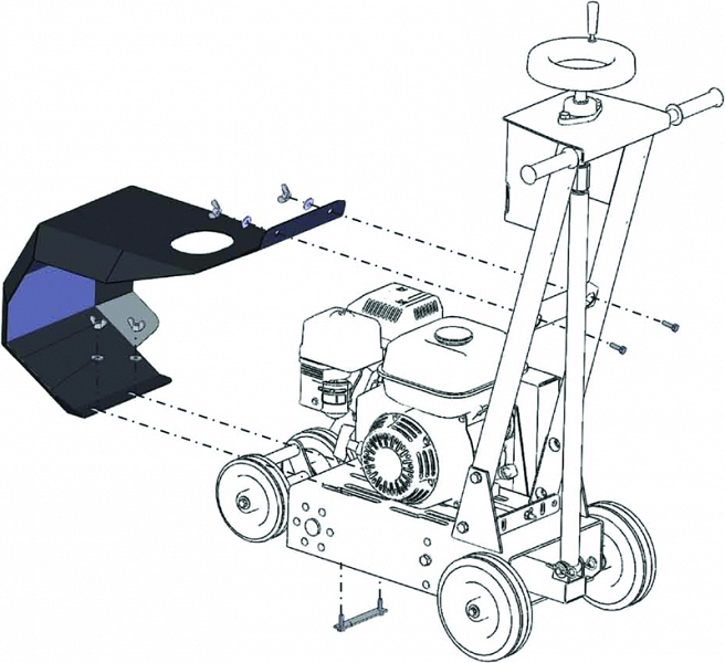 – Легкая и плавная регулировка глубины реза до 100 мм - Защитный кожух для защиты двигателя от падающего на него шлама – специальное ограждение двигателя: при резке мягкой кровли часто случается, что битумная крошка и пыль попадают на корпус двигателя и, расплавляясь, образуют пленку, которая резко уменьшает теплообмен и приводит к перегреву двигателя или становится причиной поломки его частей и выхода двигателя из строя