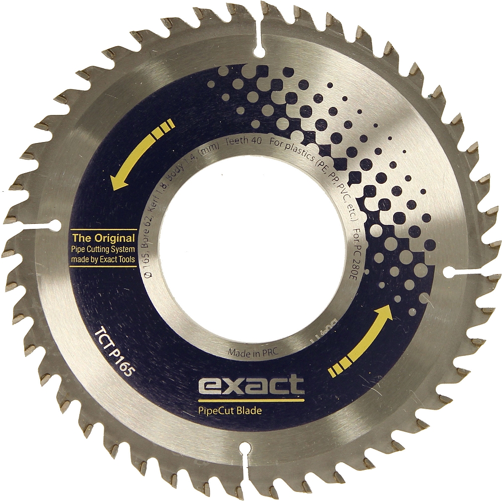 Диск пильный по пластику Exact TCT P165 (Экзакт ТСТ П165) предназначен для полиэтиленовых (ПЭ), полипропиленовых (ПП), ПВХ и других пластиковых труб. Подходит для электрических труборезов Exact PipeCut 280E, 360E.