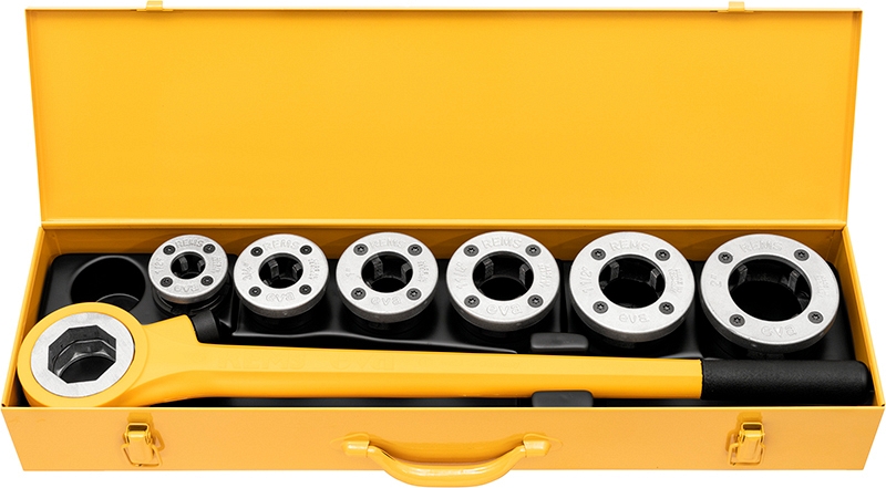 - Rems Eva Set R 1/2"-3/4"-1"-1 1/4"-1 1/2"-2". Ручной резьбонарезной клупп для трубной резьбы R 1/2", 3/4", 1", 1 1/4", 1 1/2", 2". Для правой резьбы. Один храповый рычаг для всего рабочего диапазона. Быстросменные резьбонарезные головки и плашки для правой трубной конической резьбы ISO 7-1, EN 10226 (DIN 2999, BSPT) R 1/2", 3/4", 1", 1 1/4", 1 1/2", 2". В прочном стальном чемодане.