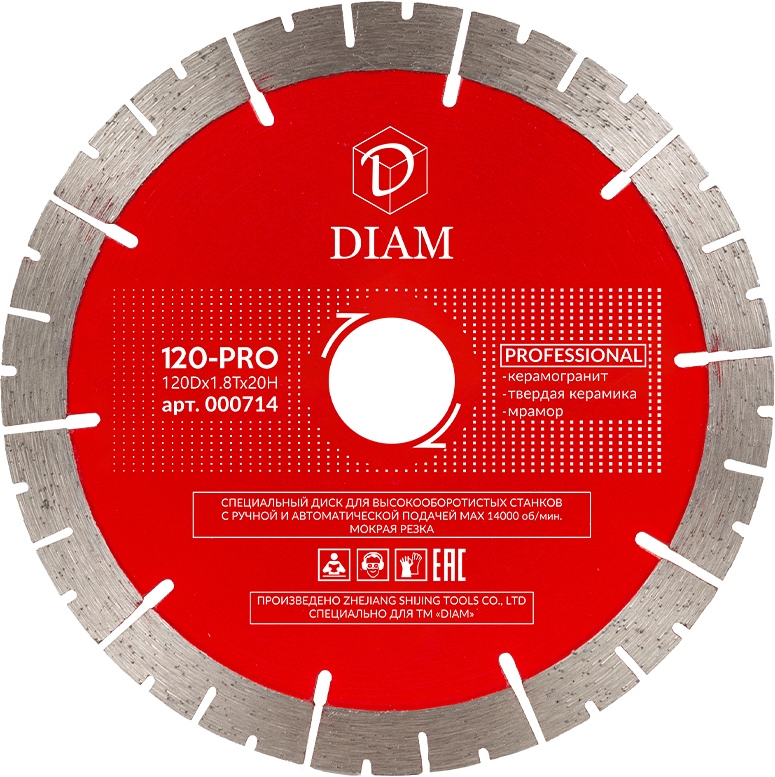 Круг алмазный Diam Professional 1A1RSS 120-Pro 120 мм (Диам Профессионал 1А1РСС 120-Про 120 мм) – диск алмазный отрезной для плиткорезов с автоматической подачей, для работы с водяным охлаждением, для деликатной, чистой резки керамогранита, кварцевого агломерата, гранита, мрамора и твердой керамики.