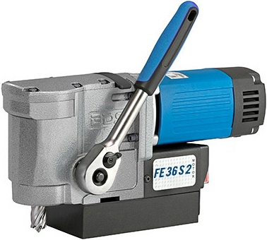 Магнитный сверлильный станок FE 36 SX (ФИ 36 СХ) на магнитном основании предназначен для сверления сквозных отверстий Ø 12 – 36 мм корончатыми сверлами в заготовках.