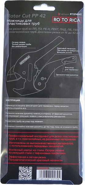 Ножницы для резки пластиковых труб Rotorica Rotor Cut PP 42 (Роторика Ротор Кат ПП 42) предназначены для резки, в первую очередь, полипропиленовых (ПП, PP), а также полиэтиленовых (ПЭ, PE), полибутеновых (ПБ, PB), поливинилхлоридных (ПВХ, PVC), металлопластиковых из сшитого полиэтилена (PEX) и многослойных (МПТ) труб Ø до 42 мм.