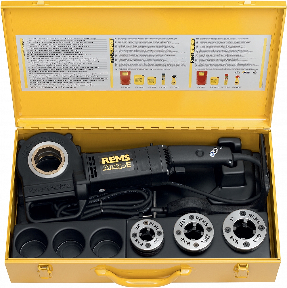 - Rems Амиго E Сет. Электрический резьбонарезной клупп со сменными резьбонарезными головками для трубной резьбы 1/8" – 1", 16 – 32 мм. Для правой и левой резьбы. Привод, опорный бугель, не требующий технического обслуживания редуктор, надежный, мощный, универсальный двигатель 230 В, 50 – 60 Гц, 950 Вт, с увеличением мощности посредством автоматической перестановки угольных щеток. Максимально потребляемая мощность до 1500 Вт. Защита от перегрузки. С быстросменными резьбонарезными головками Rems Ева для конической резьбы ISO 7-1, EN 10226 (DIN 2999, BSPT) R правой и резьбы на электроизоляционных трубах согласно EN 60 423 М. В прочном стальном чемодане.