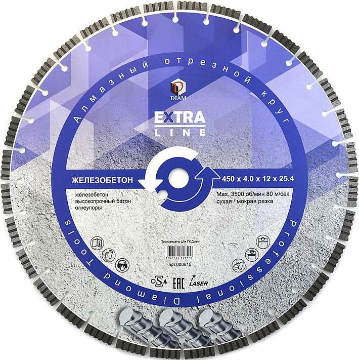 Сегментный алмазный круг Diam Extra Line 1A1RSS Turbo Железобетон 450 мм (Диам Экстра Лайн 1А1РСС Турбо Железобетон 450 мм) – профессиональный алмазный отрезной диск с лазерной сваркой сегментов для сухой и мокрой резки железобетона, старого высокопрочного бетона, клинкера, огнеупоров и других твердых материалов на камнерезных станках, стенорезных машинах, швонарезчиках, как с водяным охлаждением, так и без.
