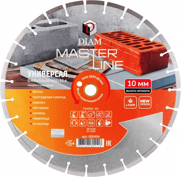 Сегментный алмазный круг Diam Master Line 1A1RSS Универсал 400 мм (Диам Мастер Лайн 1А1РСС Универсал 400 мм) – специальный алмазный отрезной диск с лазерной сваркой сегментов для сухой и мокрой резки бетона, тротуарной плитки, кирпича, черепицы, песчаника, природного и искусственного камня, строительных материалов общего назначения на бензорезах, электрических резчиках, камнерезных станках, стенорезных машинах, швонарезчиках, с подачей и без подачи воды.