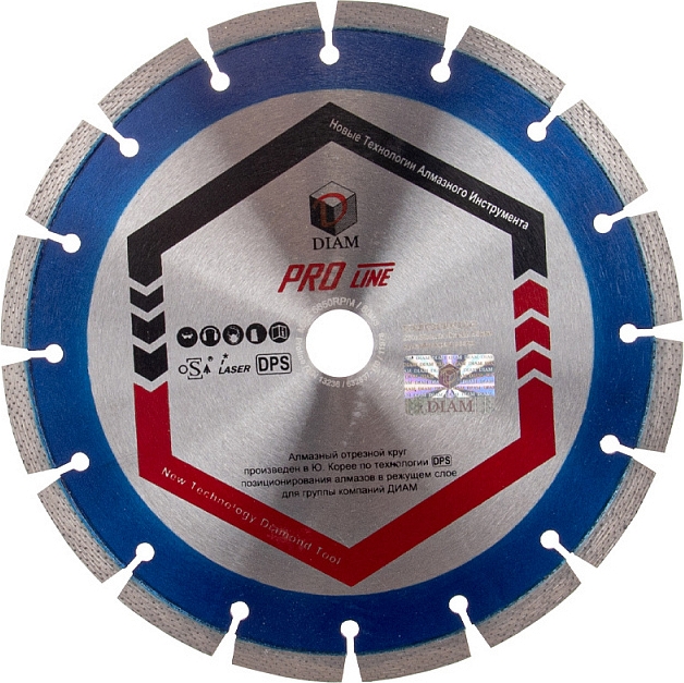 Сегментный алмазный круг Diam Pro Line 1A1RSS Железобетон 230 мм (Диам Про Лайн 1А1РСС Железобетон 230 мм) – профессиональный алмазный отрезной диск с лазерной сваркой сегментов, произведенный по технологии DPS – позиционирования алмазов в режущем слое, для сухой и мокрой резки железобетона, старого высокопрочного бетона, огнеупоров на ручном электроинструменте (углошлифовальных машинах, ушм, болгарках, штроборезах, системах резки крупноформатной плитки, бензорезах, электрических резчиках, ручных стенорезных машинах) и плиткорезах электрических, как с охлаждением, так и без.