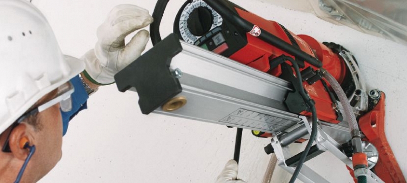 Установка алмазного бурения Hilti DD 350 (Хилти ДД 350) предназначена для мокрого сверления отверстий в бетоне, минеральных и абразивных материалах Ø 52 – 500 мм. Алмазное бурение отверстий в тяжелом бетоне алмазными коронками в мостостроении, на атомных и гидростанциях, для систем отопления и канализации, резки проемов, прокладки кабелей, монтаже водопроводных труб и систем кондиционирования. Бурение глубоких отверстий и бурение отверстий большого диаметра: люки и фундаменты, анкеры, ремонтные работы, бурение высокопрочного бетона (обязатальное использование станины, запрещено ручное сверление!)